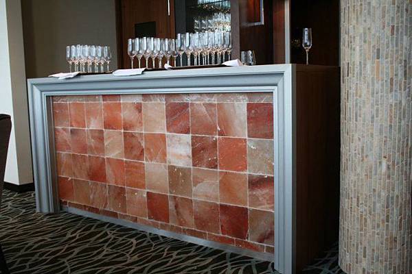國外的飯店業者使用鹽磚吧檯搭配銀色外框,讓進住的旅客可以體驗到天然無污染的鹽礦能量,而吧檯整體上看起來也不失時尚感。