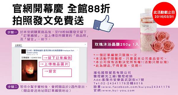 凡在官網購買商品,拍照發文(訂單編號+照片+心得)在粉絲專頁裡,即送沐浴鹽250G一瓶